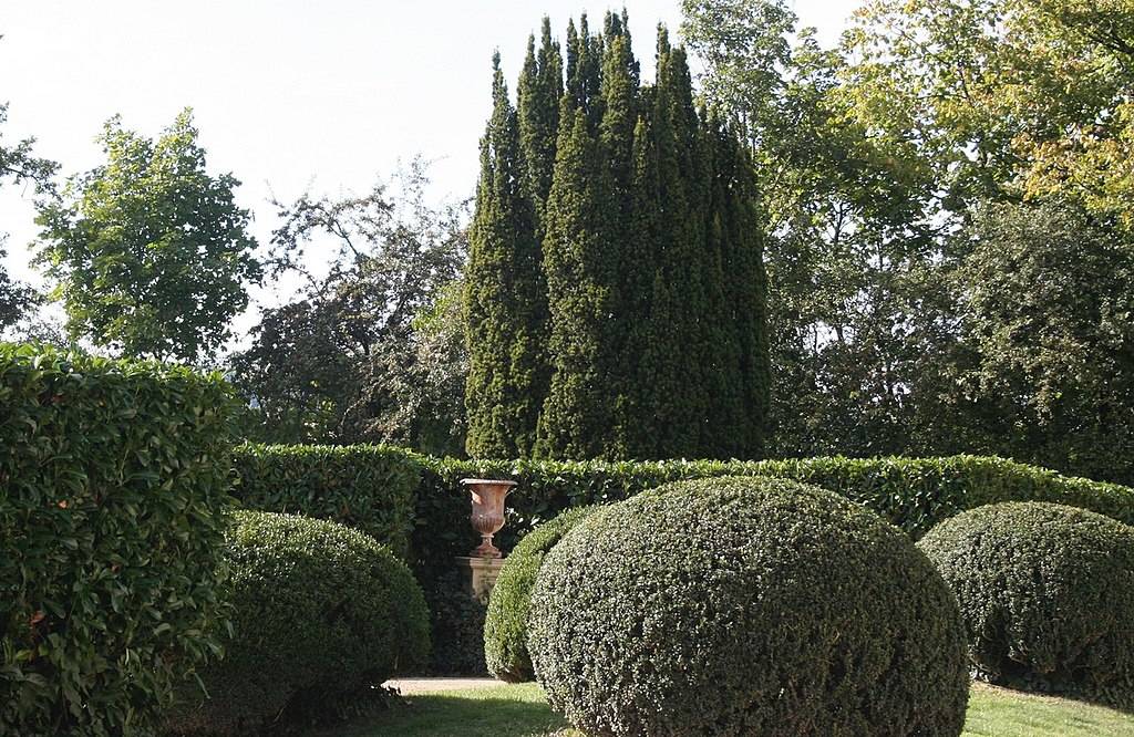 Jardin régulier avec buis taillés et bassin.