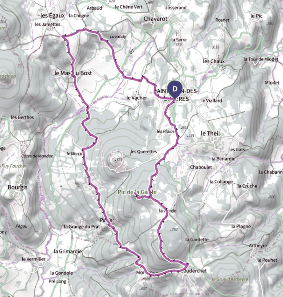 1. Au Mas du Bost, tournez à gauche avant la croix, puis descendez à gauche et prenez à droite 70 m plus loin. Continuez jusqu’à la D7 et suivez-la brièvement avant de monter sur une petite route à gauche.